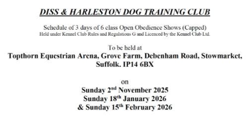 New schedule - Diss & Harleston DTC 3 Capped Shows (obedienceuk) 17/06/2025 01:06 I've just uploaded the schedule (single schedule) for 3 Capped Shows by Diss & Harleston DTC, 3 x Open, on 2nd November 2025, 18th January 2026 and 15th February 2026. Thanks to Suzanne Walker. ![]() |