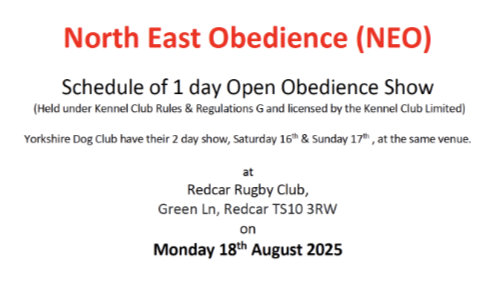 New schedule - North East Obedience (NEO) (obedienceuk) 19/06/2025 12:06 I've just uploaded the schedule for North East Obedience (NEO), Open, 18th August 2025. Thanks to Angela Gray. ![]() |