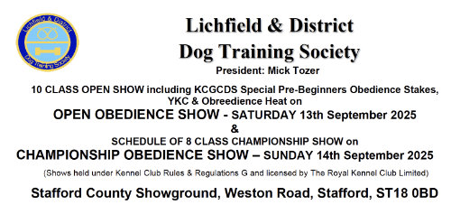 New schedule - Lichfield & District DTS (obedienceuk) 21/06/2025 02:06 I've just uploaded the schedule for Lichfield & District Dog Training Society, 13th (Open) & 14th (Championship) September 2025. Thanks to Rebecca Coleman. ![]() |