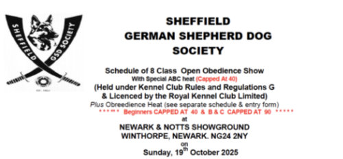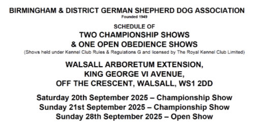 New schedule - Birmingham & District GSD Assoc (obedienceuk) 03/06/2025 06:06 I've just uploaded the schedule for the Birmingham & District GSD Association, 20th (Championship) 21st (Championship) & 28th (Open) September 2025. Thanks to Rebecca Coleman. ![]() |