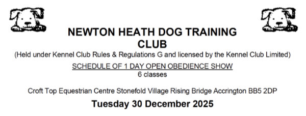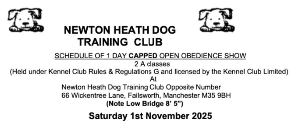 New schedule - Newton Heath DTC (2 x Class A) (obedienceuk) 02/09/2025 06:09 I've just uploaded the schedule for Newton Heath DTC, Capped Open, 1st November 2025. Thanks to Lorraine Murphy. ![]() |