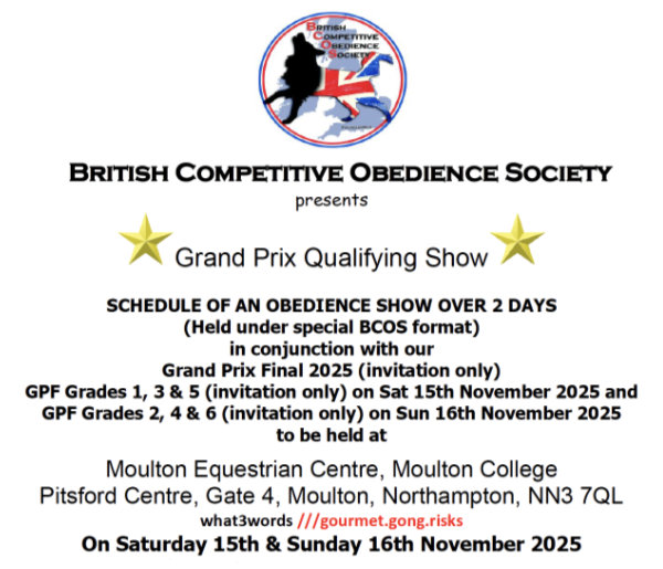 New schedule - BCOS - Grand Prix Final 2025 (obedienceuk) 25/09/2025 08:09 I've just uploaded the schedule for the BCOS - Grand Prix Final 2025, 15th & 16th November 2025. Thanks to Anita Neal. ![]() |